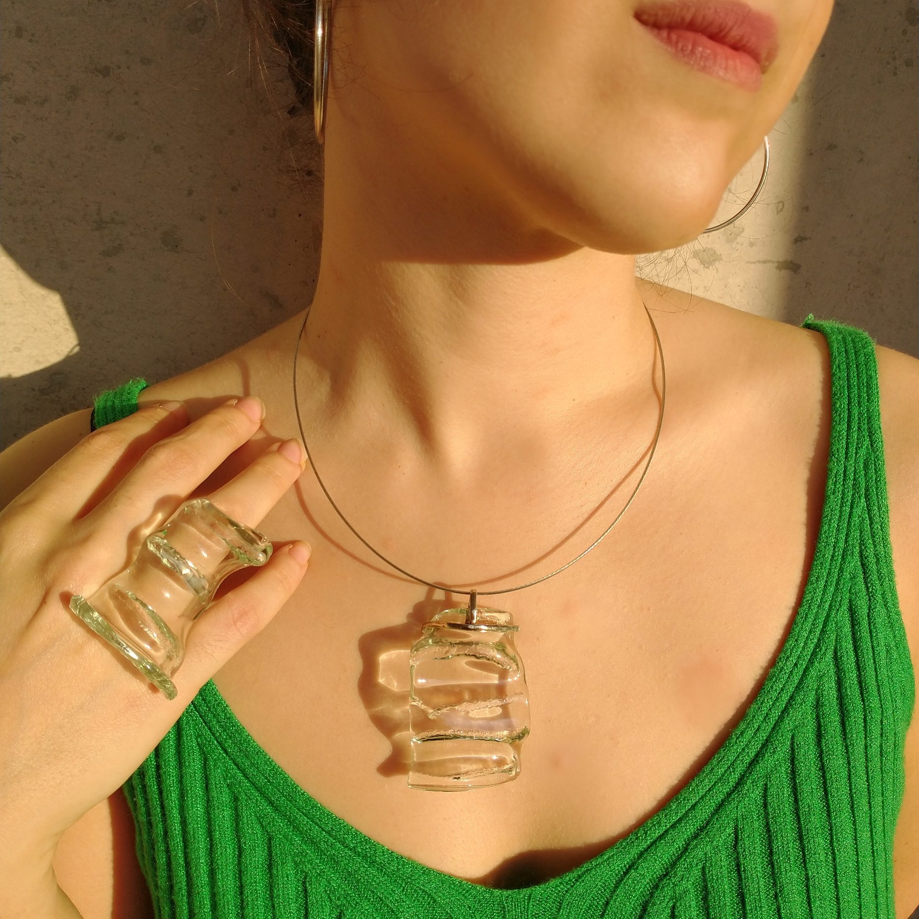 This collection originates from an experiment in thermoforming recycled glass, sourced from bottles. The result is a small sample of the aesthetic and formal possibilities that glass offers when exposed to different temperatures.